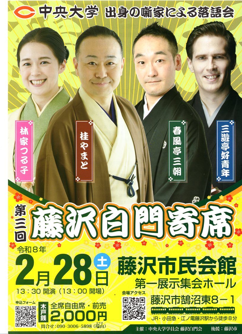 「藤沢白門寄席」は、古典・現代を問わず、落語の語りの妙と笑いの機微を存分に味わっていただきたく、母校中央大学出身の噺家の協力を得て開催しております。